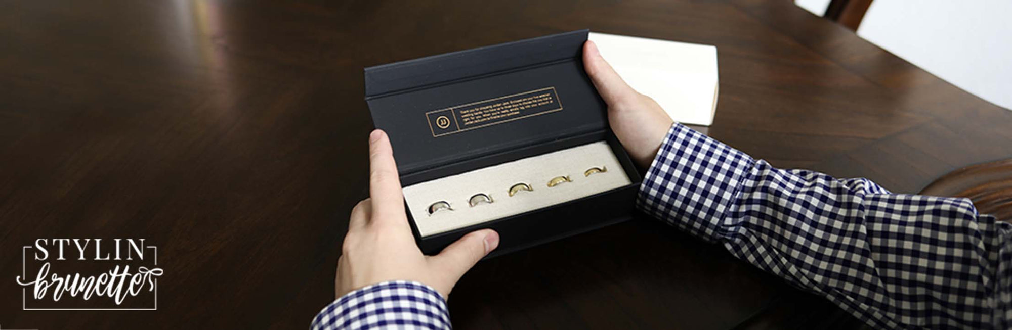 I was so lucky and excited to find Jordan Jack! Jordan Jack is a Men’s Wedding Band company that ships wedding bands right to your home. You pick 5 from the website and then they get shipped to you for you to try on! They also send you a tool to measure your finger to make sure you order the correct size. The best part is you have no commiment to buy if you do not like or love any of the rings! Oh and did mention they provide the return label to send the rings back with? Really this was perfect for us! It was so fun and magical to watch Cory receive the box and try on the rings, especially without the pressure of a salesperson watching.